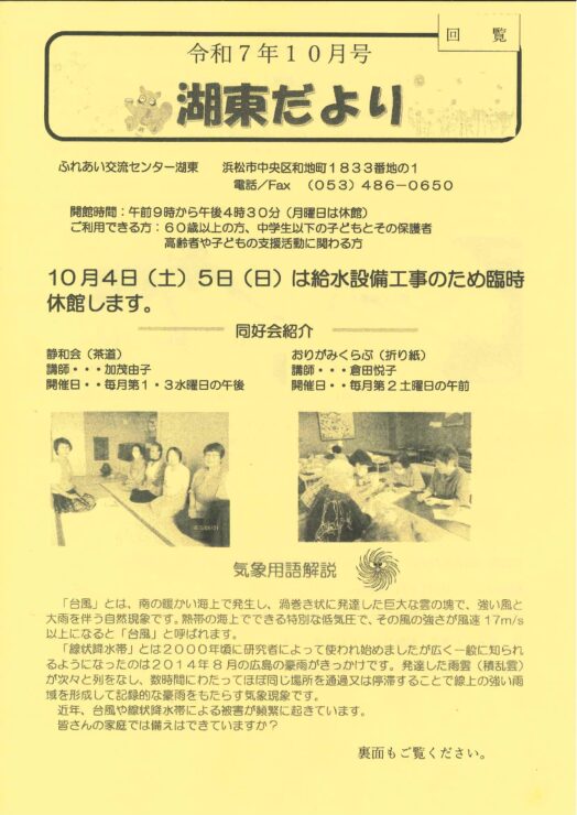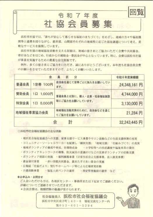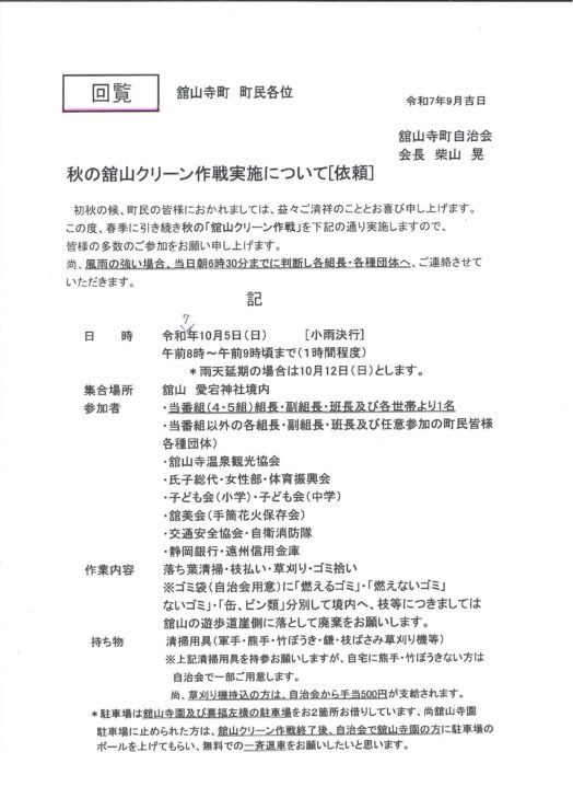 舘山寺町自治会では、組長・班長を通じて会員各戸に回覧板を月に2回行っています。実際の書面をご覧になられる方は、ご家族の一部かと思います。改めて回覧板の内容を確認する為に、回覧物の内容を掲載します。(一部掲載されない配布・回覧物、特定の組・班のみ回覧される場合がございます)