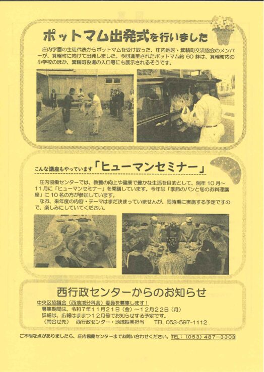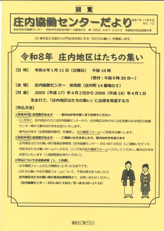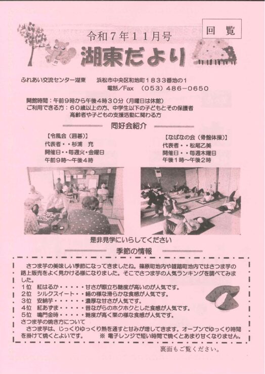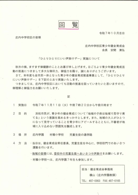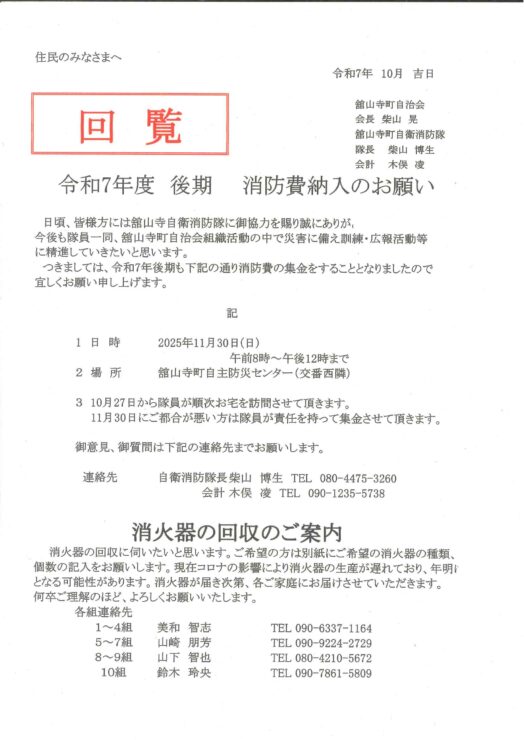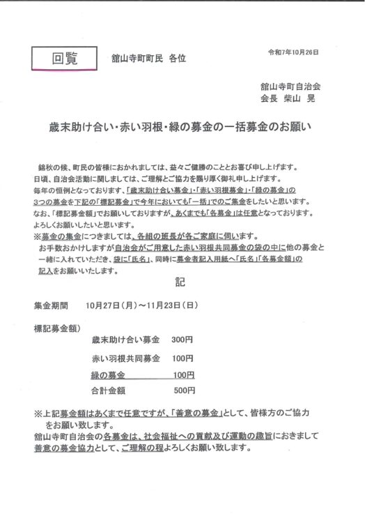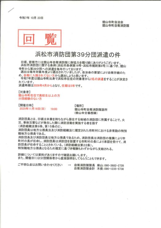 舘山寺町自治会では、組長・班長を通じて会員各戸に回覧板を月に2回行っています。実際の書面をご覧になられる方は、ご家族の一部かと思います。改めて回覧板の内容を確認する為に、回覧物の内容を掲載します。(一部掲載されない配布・回覧物、特定の組・班のみ回覧される場合がございます)