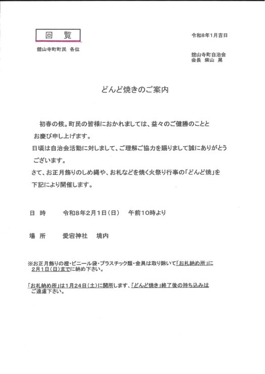 舘山寺町自治会では、組長・班長を通じて会員各戸に回覧板を月に2回行っています。実際の書面をご覧になられる方は、ご家族の一部かと思います。改めて回覧板の内容を確認する為に、回覧物の内容を掲載します。(一部掲載されない配布・回覧物、特定の組・班のみ回覧される場合がございます)