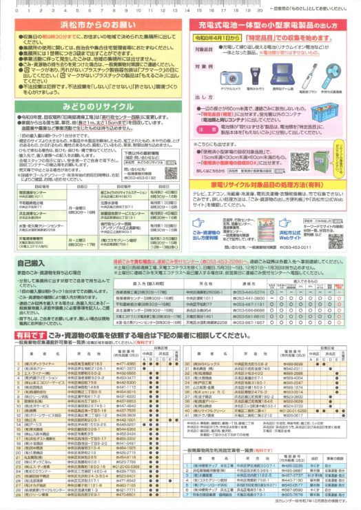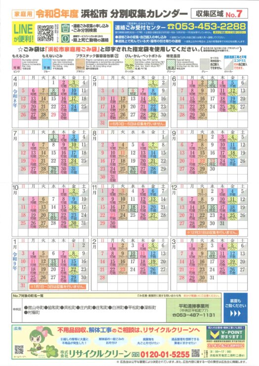 令和8年度浜松市分別収集カレンダー 収集区域No.7 のダウンロードをこちらから行えます。日本語版だけでなく、外国語版(英語、スペイン語、ポルトガル語、中国語、韓国語、ベトナム語、フィリピン語)もダウンロードできます。