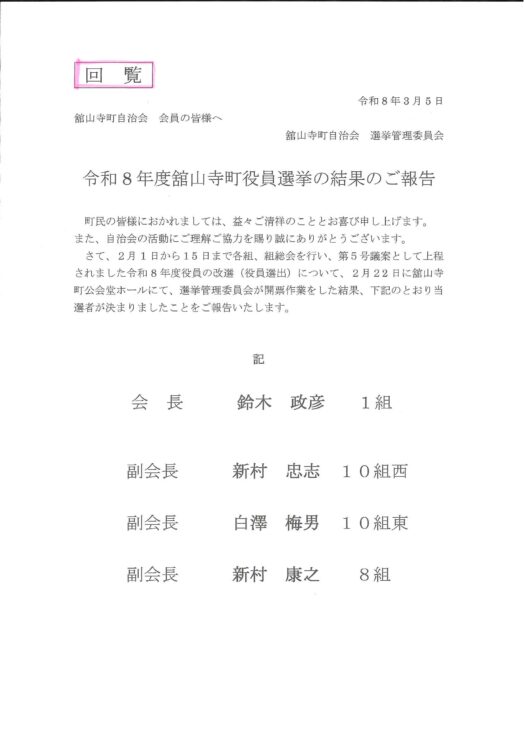 舘山寺町自治会では、組長・班長を通じて会員各戸に回覧板を月に2回行っています。実際の書面をご覧になられる方は、ご家族の一部かと思います。改めて回覧板の内容を確認する為に、回覧物の内容を掲載します。(一部掲載されない配布・回覧物、特定の組・班のみ回覧される場合がございます)