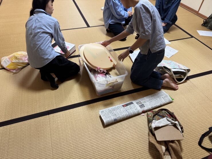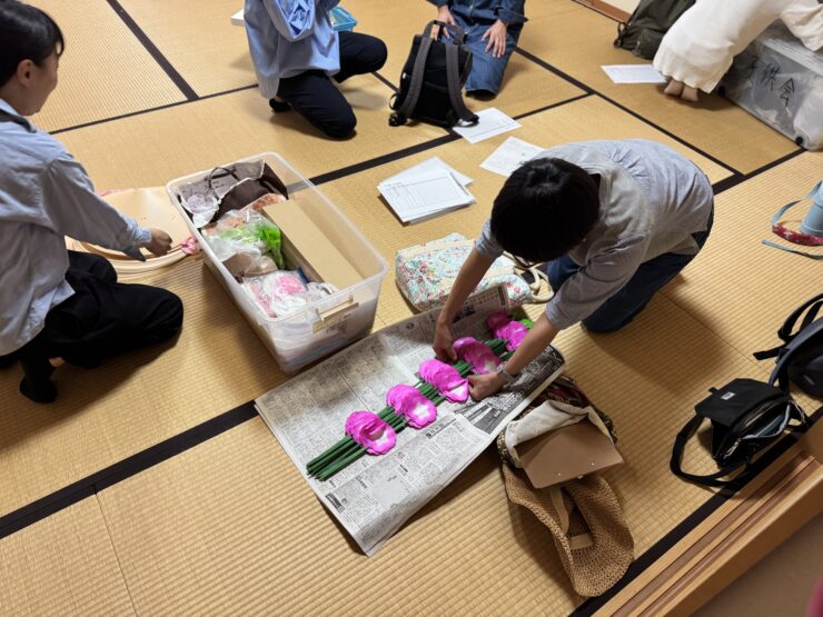 舘山寺町公会堂の中では、女性部や子供会の皆さんも準備を進めており、子どもたちが踊りで使う花笠の作成などを行われていました。